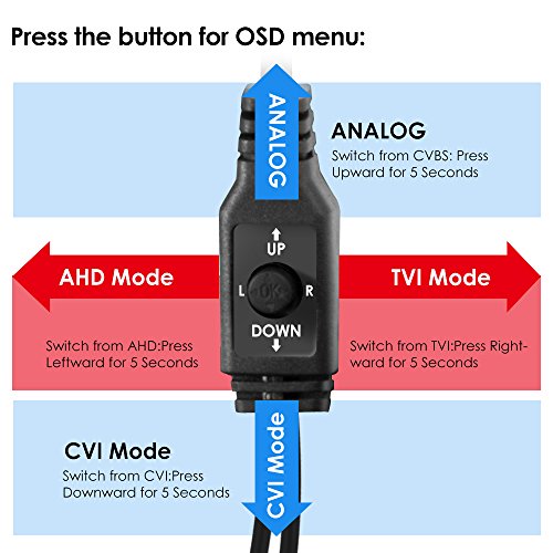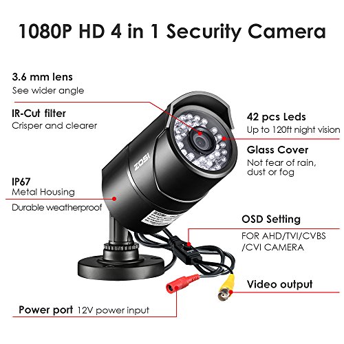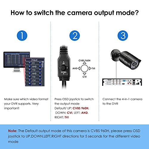 -. Feature : 2MP FULL HD 1080P 4-IN-1 SECURITY CAMERA - This 4-in-1 TVI/CVI/AHD/CVBS Bullet Camera. compatible with HD-TVI, AHD, CVI, and CVBS/960H analog DVRs. / 100FT NIGHT VISION - Built in 36pcs IR LEDs, IR 100ft/30m night vision,1980TVL ,3.6mm lens with IR CUT provide clear images, even in the dark. / INDOOR AND OUTDOOR USE - Aluminum Metal vandal proof & waterproof can withstand the toughest of outdoor conditions,3-Axis Camera Stand, cable through bracket. / 4 MODE VIDEO OUTPUT - 1080P AHD, 1080P CVI, 1080P TVI and CVBS. Default Video mode is 960H mode, compatible with all analog DVRs. 1080P video mode must be switched according to your 1080P DVR type. Widely Usage: With OSD button, you can change signal mode freely and quickly in 5 seconds. / NOTED&WARRANTY - This camera did not come with DVR. This camera comes with power supply &video power cable. Package comes with a One-year quality warranty, Lifetime Tech Support.