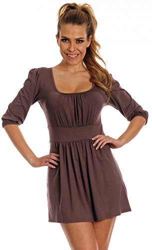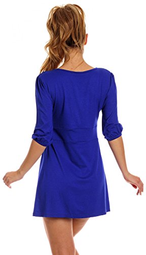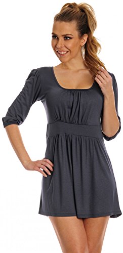 The top has 3/4 length sleeves and the front is ruched and features square neckline.