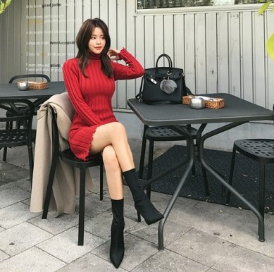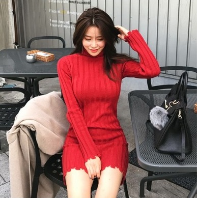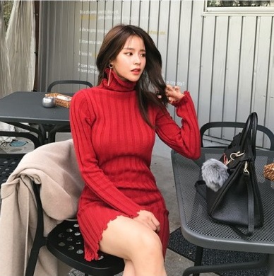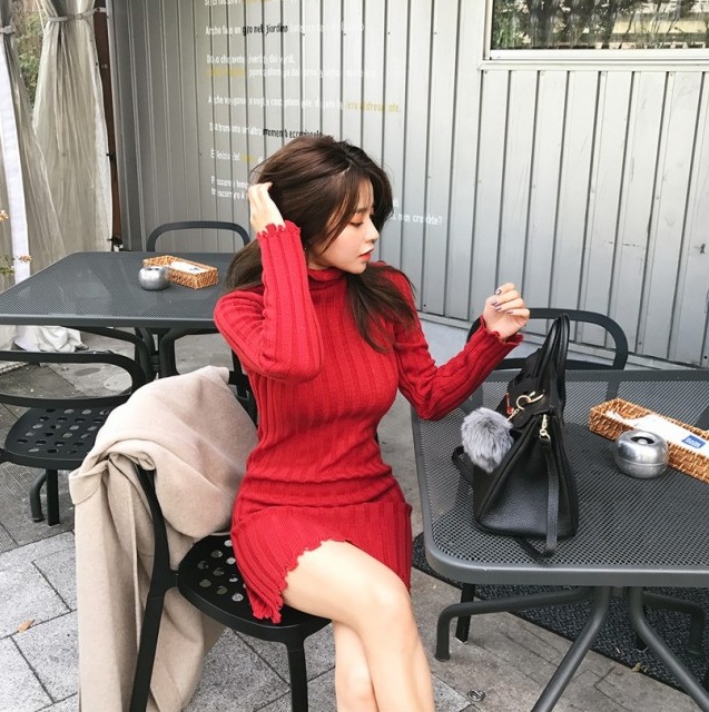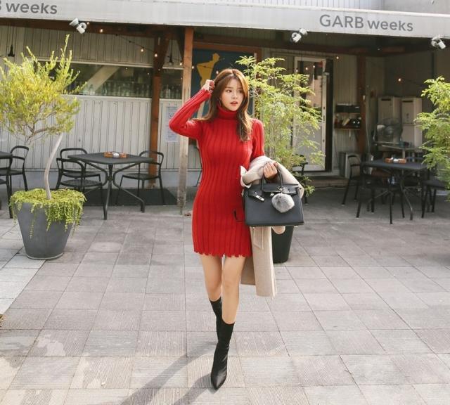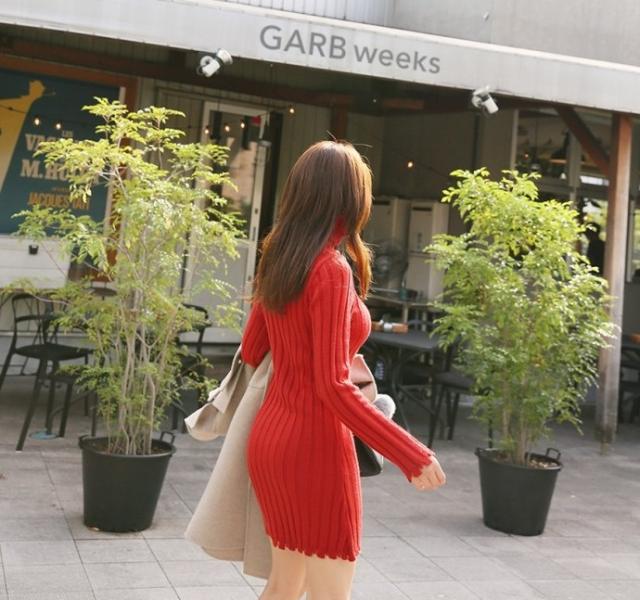 ショート タイト タートルネック 長袖 無地 カジュアルスタイル ニットワンピース