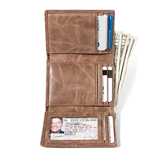 -. Feature : This soft and comfortable trifold has plenty of storage. When opened, you'll find eight card slots including a clear ID window. You also get three extra storage compartments behind the slots where you can place more cards or receipts, and a billfold area. / This Western Trifold is just a touch smaller than our traditional, making it a comfortable daily companion. The inset chrome logo adds to the red look of the wallet. / GENUINE LEATHER. This RFID Wallet offers abundant functionality while remaining redly handsome. Made with the softest, most supple genuine leather and featuring a unique crinkling technique that sests a western flair, this wallet looks and feels great, making you look and feel great too! / EVERY SLOT SHIELDED to protect your Credit Card, Debit Card, Enhanced Driver's License, Transit Card, Hotel Room Key, Passport Card, etc. transmitting at 13.56 Mhz and higher. Designed with top security in mind. As with all ID Stronghold wallets, every slot, ID window, billfold, and compartment is individually shielded, so your information is protected, no matter where you place your RFID cards. This is not a feature found in most RFID wallets. / PERFECT GIFT! Each wallet comes with its own original ID Stronghold GIFT BOX so you can buy one for yourself, and one for a friend. Looking for something different? Just search for ID Stronghold at the top of Amazon to find all of our styles. OUR PROMISE - If, for any reason, you do not love your Brand New Wallet, we will refund 100% within 30 days. No questions asked. Buy now RISK-FREE. Product Dimensions: 4.25 x 3.125 x 0.75 inches • Product Weight: 3.0 ounces