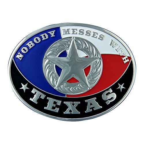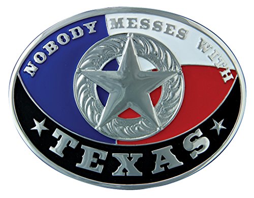 Studio : Montana Silversmiths Publisher : Montana Silversmiths Binding : Apparel Product Description A perfect fit for a Texas attitude, this buckle says it loud and proud: "Nobody Messes with TEXAS". The oval shape cast nickel buckle is framed in a smooth polished trim with large, bold shapes of a silver engraved concho set on the Texas flag colors. Standard 1.5" belt swivel.