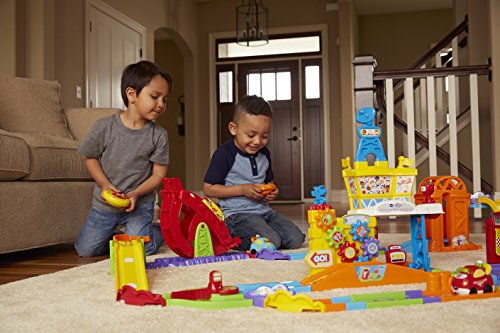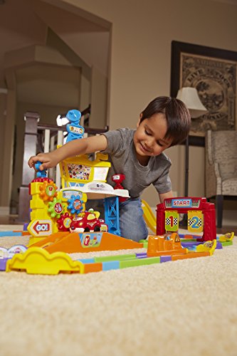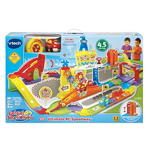Zip around the VTech Go! Go! Smart Wheels Ultimate RC Speedway, and speed through four action zones and over nine SmartPoint locations. Use the steering wheel-shaped remote control for an exciting interactive experience with the RC SmartPoint Racer! The speedway is 4.5 feet wide and includes 13.5 feet of interchangeable tracks, a stunt ramp, elevator, movable gears, starting flags and track switches that are all triggered by the RC race car. Ralph and his race car entertain your little one with a light-up driver button that activates playful music and fun sounds. He also teaches the letter R and the vehicle's name. Get another RC SmartPoint Racer (sold separately) and race a friend! Inspire the imagination and build an entire world by connecting to other Go! Go! Smart Wheels and Go! Go! Smart Animals playsets (sold separately). Requires 3 AAA batteries (batteries included for demo purposes only; new batteries recommended for regular use). Intended for ages 1 to 5 years.Feature
