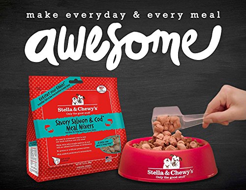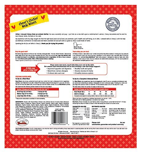 -. Feature : Kickstart Your Kibble! Dogs naturally crave meat, much like they ate in the wild. That's why every batch of Chewy's Meal Mixers starts with 95% cage-free chicken, beef or wild caught salmon, organs and bone plus 100% organic certified fruits and vegetables to guarantee your pet is eating as nature intended. All ingredients are sustainably sourced, and NEVER from China. Add a scoop to your dog's kibble for a boost of real freeze-dried raw food nutrition and taste / Made in the USA - Stella & Chewy's Meal Mixers' all-natural recipe is crafted with care in small batches in Stella & Chewy's own USA kitchen to provide the highest levels of protein-rich meat and quality grain-free nutrition for your pet / Minimally-processed and all natural. Because the closer foods stay to their natural state, the better they are. That's why each of Stella & Chewy's recipes contains NO added hormones, antibiotics, grains or fillers. Best of all, it's 100% complete and balanced for all life stages / Raw nutrition AND convenience - Your pet deserves to thrive on real, raw meat. Now Stella & Chewy's makes it easier than ever to give your pet real raw nutrition with the convenience of freeze-dried. Simply scoop, mix and serve (scoop included in each bag!) Supports better health for your pet with improved appetite and digestion, relief from allergies, vibrant skin and coat, healthy teeth and gums, greater stamina and vitality and a healthy immune system / Each Order Comes with an EXCLUSIVE Pet Paws Notepad
