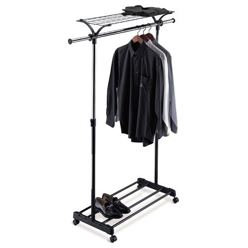 -. Binding : Kitchen -. Brand : Organize It All -. Color : Black -. Department : Accent -. EAN : 0014982170309 -. Feature : Steel garment rack on rolling casters / Black and chrome poles can hold over 200 lbs. / Adjustable rack sits at your desired height / Heavy grid top shelf for additional storage / Overall dimensions: 17L x 59W x 71H inches -. IsAutographed : 0 -. Label : Organize It All -. Manufacturer : Organize It All -. Model : 1703W-1 -. MPN : 1703W-1 -. NumberOfItems : 1 -. PackageQuantity : 1 -. PartNumber : 1703W-1 -. ProductGroup : Home Improvement -. ProductTypeName : HOME -. Publisher : Organize It All -. SKU : M295523 -. Studio : Organize It All -. Title : Adjustable Garment Rack with Shelf in Black and Chrome -. UPC : 014982170309