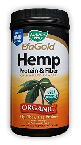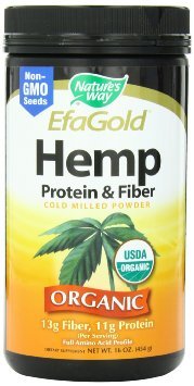 Hemp Protein & Fiber Powder 16 oz 16 oz PowderProduct DescriptionNature's Way EFAGold is the highest quality Hemp seed powder and one of nature's richest sources of protein, fiber and essential fatty acids - guaranteed to contain 13 grams Fiber and 11 grams Protein per serving all from non-GMO seeds. Our Hemp powder is delicious and has a wonderful natural taste. It is Organic, cold milled, unrefined, hexane free and has zero trans fat. You can get your daily fiber (soluble & insoluble) and protein needs plus additional vitamins, minerals, lignans, all 8 essential amino acids and EFAs. We believe in quality control from the soil to the oil Our involvement begins in the fields with the growers and continues through harvesting, seed selection, milling and purity testing.