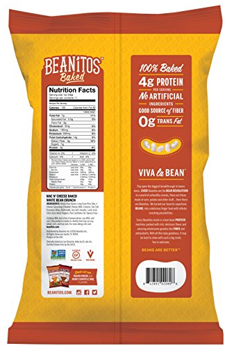 Product Description Mac n’ cheese is mainly known for being an indulgence snack. Not anymore! Experience the delicious goodness of mac n’ cheese paired with an irresistible crunch thanks to Beanitos Baked Mac n’ Cheese White Bean Crunch. Beanitos Crunch are baked to crispy perfection while delivering a flavorful explosion of melted mac n’ cheese. Guilt-free bean chips you won’t regret eating. Beanitos snacks are packed with PROTEIN FIBER, always gluten free, non-GMO, corn free and taste incredible. The best part ? they’re made from wholesome beans! 0