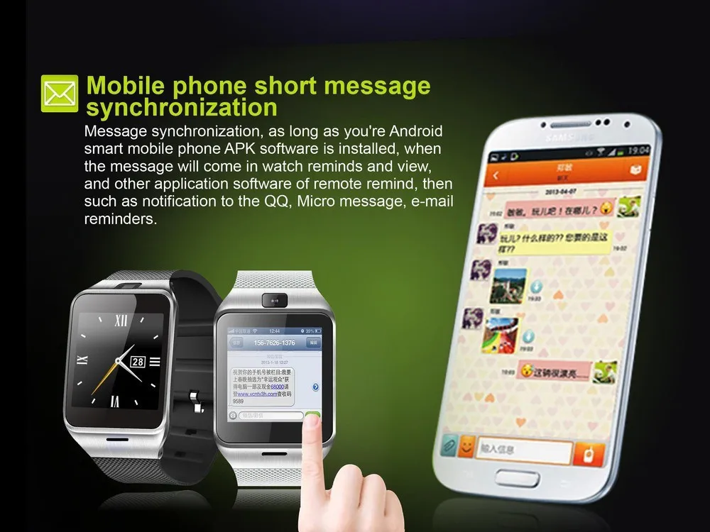 Message synchronization,as long as you are Android,smart mobile phone APK software is installed,when the message will come in watch reminds and view,and other application software of remote remind,then such as notification to QQ,Micro message,e-mail reminders.