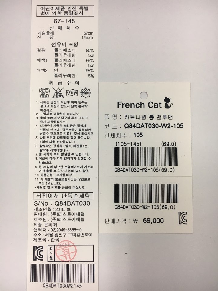 제조자 : 퍼스트어패럴