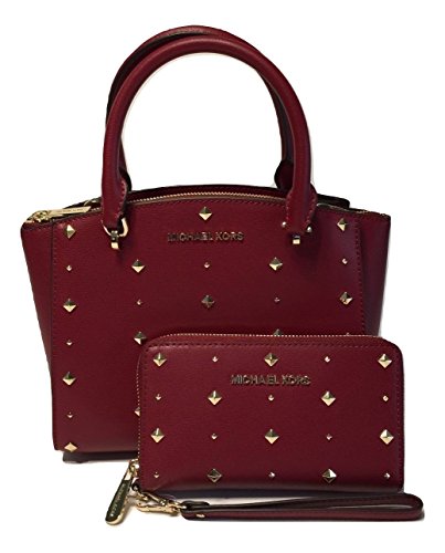 -. Feature : Bundle of 2 items: MICHAEL Ellis SM Convertible Satchel and Jet Set Travel LG Flat Phone Wallet Wristlet / Top Zip, studded details in gold, Durable new design saffiano/smooth leather, Top handles and shoulder strap / Interior : 1 main compartment, 2 zipped compartments on both sides, 4 slip pockets, 1 zip secure pocket. / Signature lining. Exterior:back hidden slip pocket , front studs and logo plate / Measures Approximately: 9"X8"X4.5" with adjustable and detachable strap