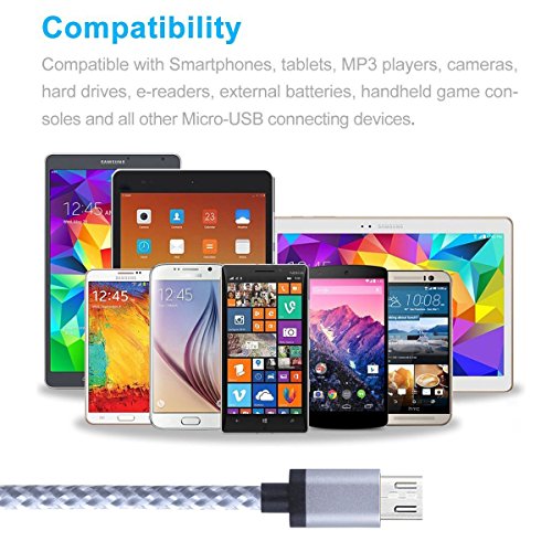 Powerful Compatibility: Support Use this cable to charge and or sync any Samsung Galaxy S_ Galaxy Note_ HTC One M9_ Nokia Lumia_ Motorola Droid Turbo_ LG G2/G3_ Google Nexus_ HUAWEI and other more devices. No Error Messages. Fast Charge and Data Transfer: High-quality tinned copper wire+ 2A fast charge_ fast charge_ up to 30%. USB 2.0 Cable - A Male to Micro B_ Supports 480-Mbps transmission speed. Amazing combination: Gold-plated connectors resist corrosion for signal purity Compact Lightning Connector head works with nearly all cases; Stylish nylon braided jacket not only enhance durability_ but also looks more fashion and fresh. Perfect Length: 6ft is a proper length for using in sofa_ in bed_ in car or other places. The bundles of the micro USB cable can make your life more convenient Warranty and Service: a week``s unconditional replacement or money-back guarantee_ friendly customer service and 12 months quality assurance