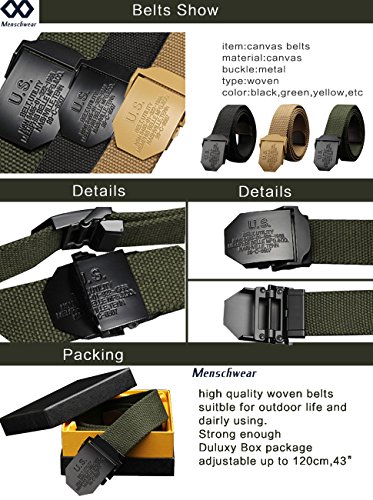 Menschwear is supplying mens leathers betls,canvas belts, gift-using wooden belts, survival wasitband,and steel selfguard belts. Introduction Brand:Menschwear Military Stylish Canvas Belt with Move Metal Buckle; Unisex High Quality Canvas Belts; Perfect for Jeans or Casual Wear; Fully adjustable length and easy to use; Condition: 100% Brand New High Quality; Material: Canvas Weight: 210g; Belt Wide:38mm/1.5 inch; Belt Thickness:3.5mm/0.13 inch; The Length of Belt including Buckle:120cm:125cm/49.2 inch;140cm:145cm/57.2" The Length of Belt:120cm/140cm Package Includes: 1 x Canvas Belt 0