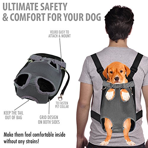 Dog Carrier | Comfortable Legs Out Front Dog Carrier Backpack with Tail Hole | Travel Dog Cat Pet Bag for Travel Cycling with Adjustable Shoulder Strap and Inner Collar | Grey | L | Bonus Feeding Bowl