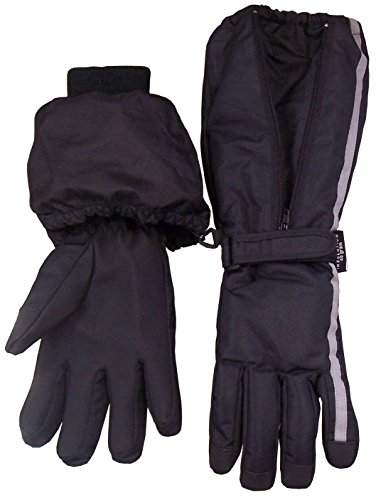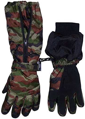 Binding : Apparel Product Description N'Ice Caps TM boys Thinsulate and waterproof long elbow cuff glove with zipper, gusset over zipper opening, knit cuff under elbow cuff, reinforced gripper palm, thumb and fingers. Velcro wrist strap, elastic under wrist. Great for all winter outdoors activities. Colors: black, royal, navy. green camouflage print, black/grey digital print, charcoal grey solid. 3 sizes. One size fits 2-4yrs (3.75" across palm, 5.5" from elastic to end of middle finger.) One size fits 4-7yrs (4" across palm, 6" from elastic to end of middle finger.) One size fits 8-12yrs (4.25" across palm, 6.5" from elastic to end of middle finger.) One size fits 4-5yrs (4" across palm, 5.5" from elastic to end of middle finger.) One size fits 6-7yrs (4" across palm, 6" from elastic to end of middle finger.) One size fits 8-9yrs (4.25" across palm, 6.25" from elastic to end of middle finger.) One size fits 10-12yrs (4.25" across palm, 6.5" from elastic to end of middle finger.) One size fits 13-15yrs (4.5" across palm, 7" from elastic to end of middle finger.) Tested and approved as per CPSIA standards. 0
