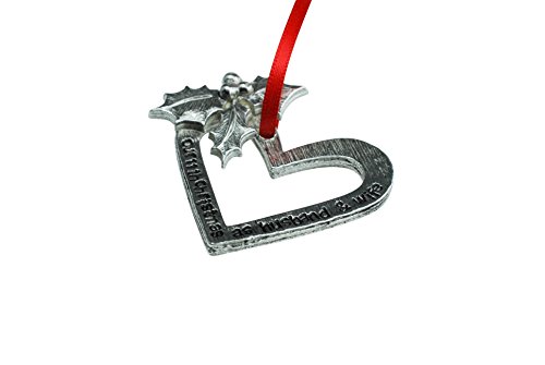 Features a Rustic Hanging Heart Which Hangs From a Red Ribbon with a Cast Holly in The Left Hand Corner. The text is hand stamped so no piece is the same.