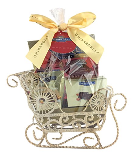 -. Feature : Ghirardeli Silver Sleigh Gift Basket includes: / and Gourmet Milk Sea Salt Escape Square / Ghirardeli Hot Chocolate, Dark Chocolate Rasberry, / Toffee Crunch Squares, Dark & Sea Salt Caramel Squares,