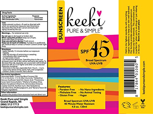 Naturally shield and nourish skin with this antioxidant-infused SPF 45 sunscreen. This light, fast absorbing, non-staining, naturally scented formula gives skin an immediate line-smoothing finish. With the Keeki all-natural Broad Spectrum sunscreen, you’ll have the full UVA/UVB protection you need. There are only organic ingredients used so you don’t have to worry about putting any chemicals on your skin. Perfect for beach, pool, or just a day under the sun. You can use this sunscreen all over your body, even on your face. It’s safe to use on even a baby's soft, delicate skin. This sunscreen is water resistant for up to 40 minutes so you don’t have to worry about it coming off of your skin while you swim. The Keeki Pure & Simple company does not test on animals and our products are made right here in the USA. While improving elasticity and helping skin retain moisture, you can feel safe using Keeki Pure & Simple products because they are made with nourishing ingredients like: • Jojoba Seed Oil • Coconut Oil • Cocoa & Shea Butter • Sunflower Seed Oil • Aloe Vera • Vitamin E Keeki Pure & Simple doesn't believe in cutting corners when it comes to your health ... therefore, they vow to never use any of the following ingredients: • Parabens • Pthalates • Toluene • Formaldehyde • Acetone • Synthetic Fragrance • Sodium Laureth Sulfate, Sodium Lauryl Sulfate • Nanoparticles • Gluten ORDERS YOURS TODAY!Feature