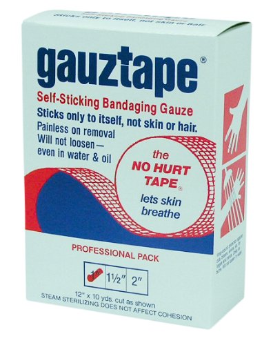 -. Feature : Gauztape 1 Inch x 10 Yards. / Self-Sticking Bandaging Gauze. / Sticks only to itself, not skin or hair. / Painless on removal will not loosen- even in water & oil. / Wrap-around protection against cuts, blisters, slivers etc. for fingers and hands.