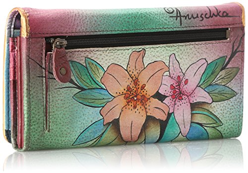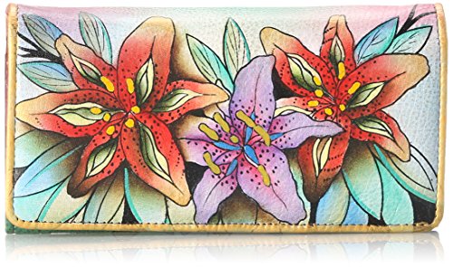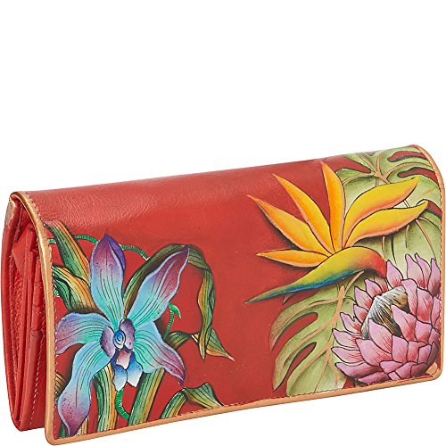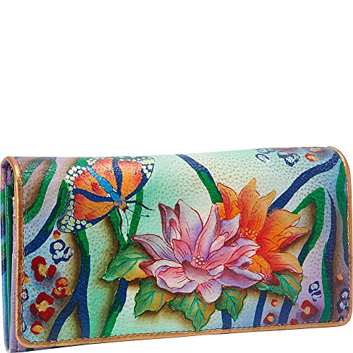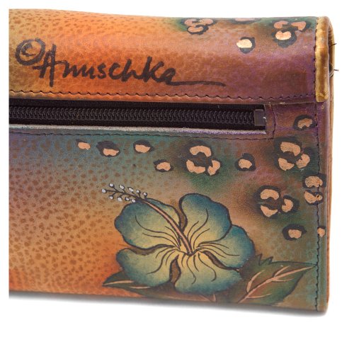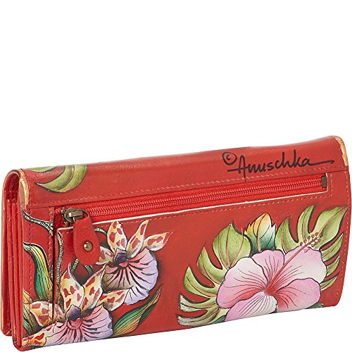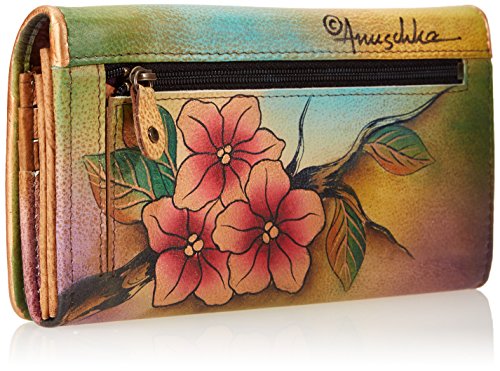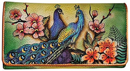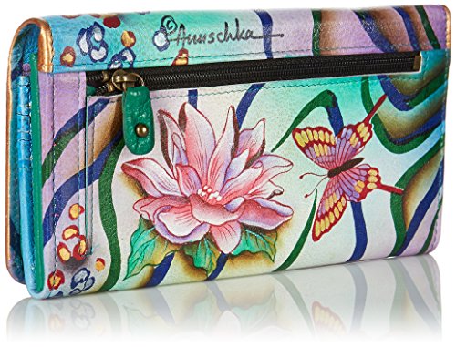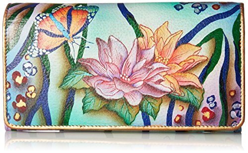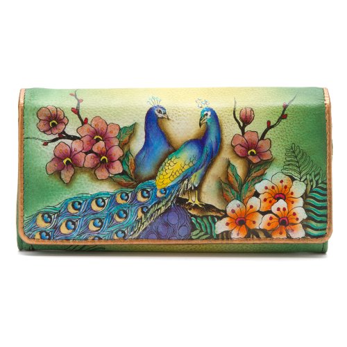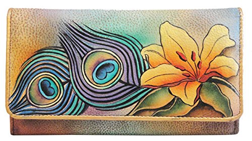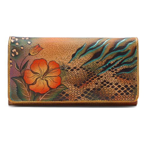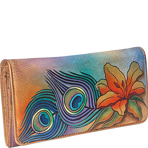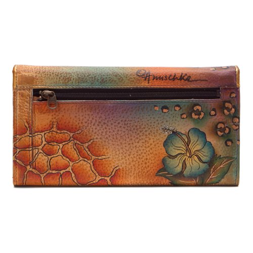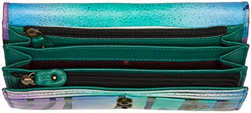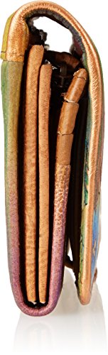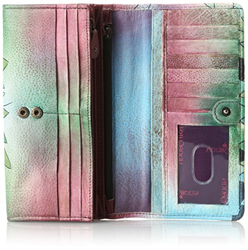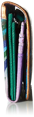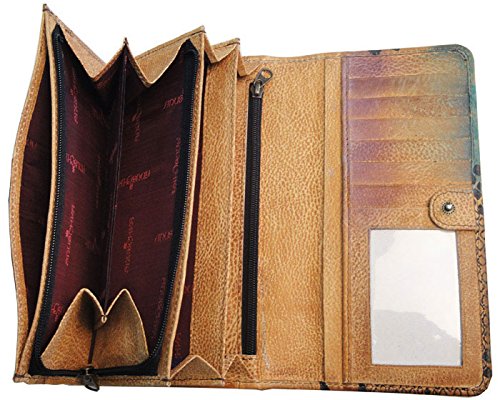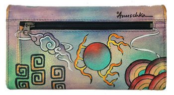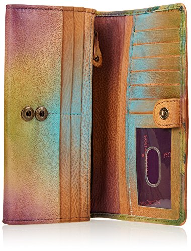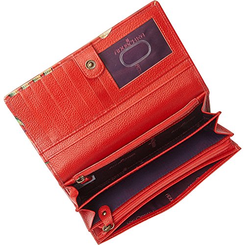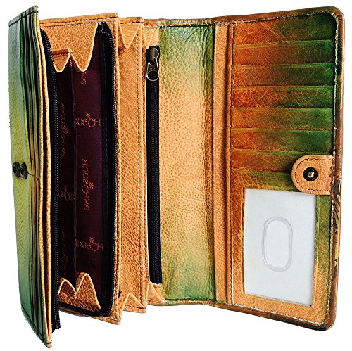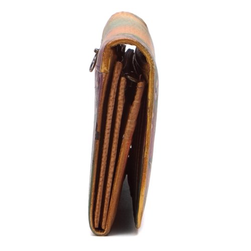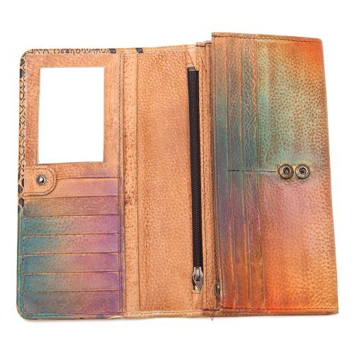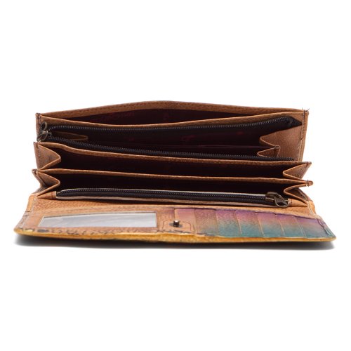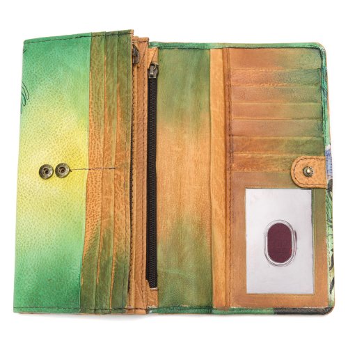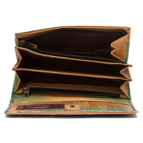 Product Description This vibrant wallet will make it easy to organize all your essentials in boho elegance. It has a ?ap open entry with adjustable snap closure, six full length slip pockets, ?ve full length zippered pockets,2 wall zippered pockets, twelve card holders and an id window. Accordion style gusset opens 5.5” wide. 7.5”X4” 0