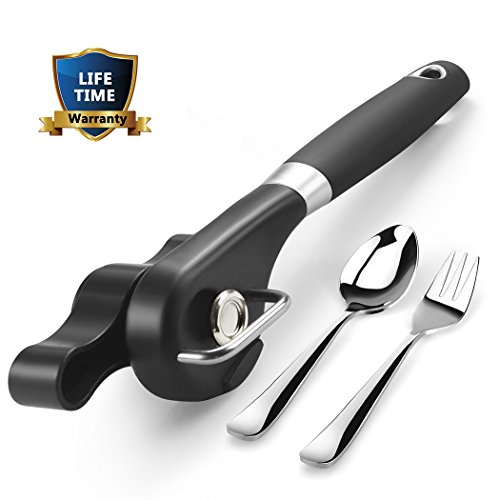 WHAT YOU WILL GET 1*can opener1*gift spoon1*gift fork FEATURES AND BENEFITS Made from high-quality food-safe stainless steel which won't rust. Durable, ergonomic can opener with a built-in safety feature that dulls and smooths can edges to prevent injuries. Requires no washing because it does not come in contact with the food, simply rinse it to prepare it for next use. It can safely be used by people of all ages, especially children and seniors. Besiva will always provide the best product and service.Thank you for choosing us. 0