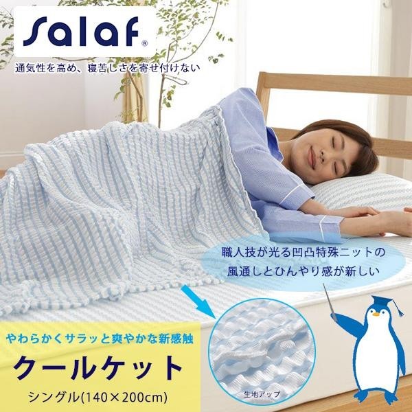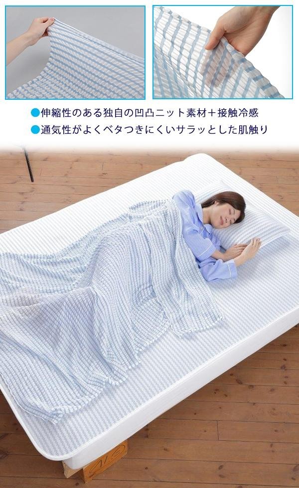 | 職人技が光る凸凹特殊ニットの風通しとひんやり感が新しいクールケットです。蒸し暑い夏にピッタリのサラッと爽やかでやわらかい感触なので、寝苦しい夜のお助けアイテムです。家庭洗濯機で丸洗いできるのでお手入れも簡単で衛生的! |