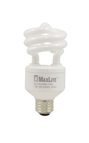 Studio : MaxLite Publisher : MaxLite Binding : Tools Home Improvement Product Description The MaxLite MLS15EADWW is a CFL light bulb with a 2700K color temperature. This gives it a warm white glow. This MaxLite bulb has a E26 base with a spiral bulb shape.This MaxLite CFL bulb has a lumen output of 900 with a wattage of 15W, which is the equivalent of an incandescent bulb with wattage of 60W. This MaxLite light bulb features dimmable capabilities. This MaxLite light bulb has a lifespan of 8,000 hours. 0
