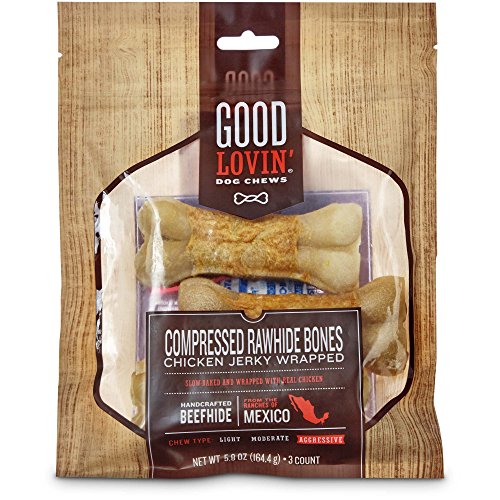 -. Binding : Misc. -. Brand : Good Lovin' -. EAN : 0800443274149 -. Feature : Chicken Jerky Wrapped Compressed Rawhide Bone Dog Chews from Good Lovin' / Beefhide is handcrafted and oven dried to perfection / Chew Type, Aggressive / From the ranches of Mexico / Satisfies their instinct to chew -. Label : Good Lovin' -. Manufacturer : Good Lovin' -. MPN : 979PT -. PackageQuantity : 1 -. PartNumber : 979PT -. ProductGroup : Pet Products -. ProductTypeName : PET_SUPPLIES -. Publisher : Good Lovin' -. Studio : Good Lovin' -. Title : Good Lovin' Chicken Jerky Wrapped Compressed Rawhide Bone Dog Chews, Pack of 3 -. UPC : 800443274149