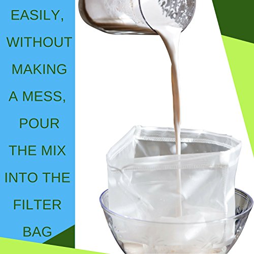 ENJOY SMOOTH MILK WITHOUT PARTICULATES: super fine nylon mesh lets liquids through, no pulp, debris or solids. This milk bag features a nylon mesh that’s 200 microns, which filters out the things you don’t want much better than screens, cloth and cheesecloth. Making milks with this filter bag couldn’t be any easier; simply blend almonds (or whatever nuts you prefer) in a blender with water, pour the contents into the bag, and drain the liquid from the bag into a bowl. Drawstring prevent spills