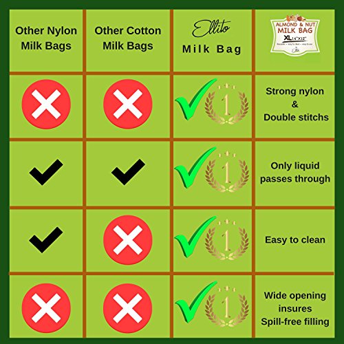 PREVENT SPILLS WITH THE LARGE SIZE - 14 INCH BAG IS EASIER TO USE. Unlike other sieve strainer bags the Ellito strainer is a large, professional, restaurant grade strainer for any kitchen! It’s perfect for making a healthy vegan / vegetarian drink like soymilk, or coconut milk; making a juice smoothie, or soup; Straining out liquids; And making patties, iced coffee or tea. PLUS, our 14 inch wide, 12 inch high bag easily fits over any jug, jar, food processor or blender for easy filling