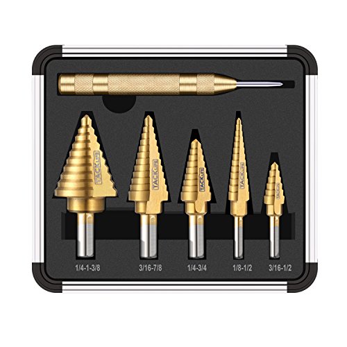 Tacklife PDH06A Classic Titanium Step Drill Bit Set & Automatic Center Punch,High Speed Steel |5-Piece Set| Total 50 Sizes,Double Cutting Blades Design with Aluminum Case
