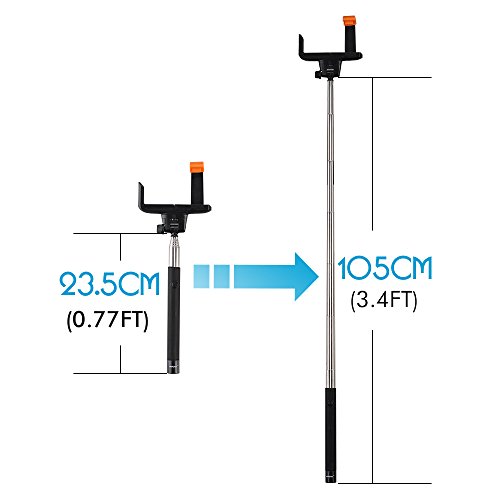 - Feature : Mpow Brand Certified: Top-Brand Bluetooth Accessories for Smartphones. / The Most Popular Selfie Stick on Amazon, with Built-in bluetooth remote control & great battery, allows you to take a self-photograph or group photos easily with a better photo sight. / Simple to Use: Just turn it on, pair it with smart phone via Bluetooth and then Snap. / Can maximally extend to 3.4 Feet from 0.77 Feet; and 180-degree adjustable head ensure you to find a best & beautiful angle when selfie phtographing. Specially,the orange rubber pad guarantee 100% Safe and Stable on the clip. / Compatible with most Android and IOS system Smartphones. The adjustable grip holder fits smartphones size up to 5.5 Inch maximally. To avoid unnecessary disappointment, please refer to our compatibility list before you purchase.