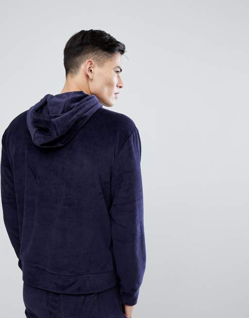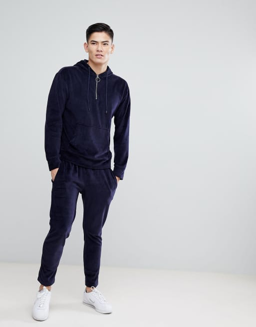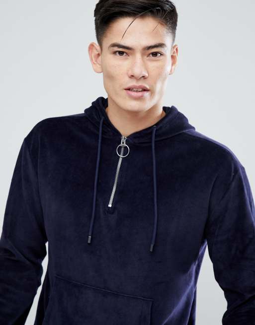 Mango Man Velour Hoodie With Half Zip In Navy
