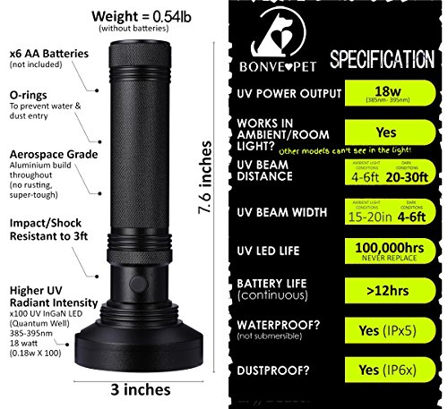 Upgraded UV flashlight: 100 powerful UV leds can send out beam of UV light, that covers a larger area and will help you to easily find out the hiding dog urine, stains or other fluorescent substances.