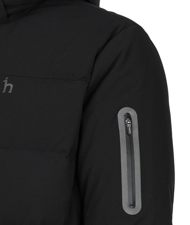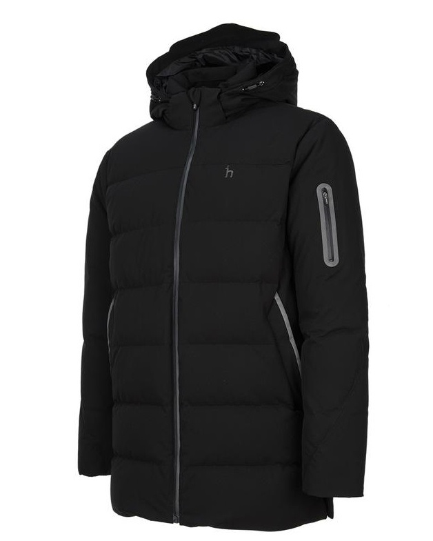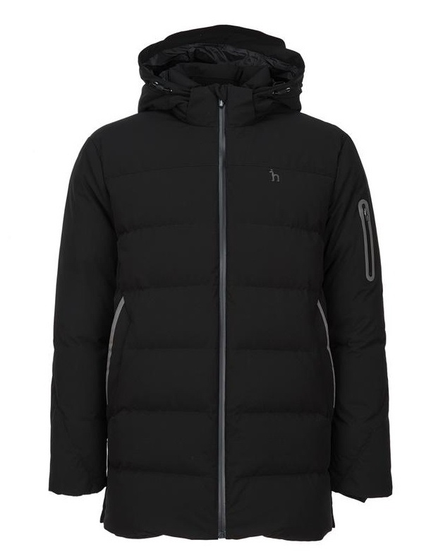 지퍼 여밈을 활용해 탈착 가능한 후드 디자인의 세련된 하이넥을 더하였으며