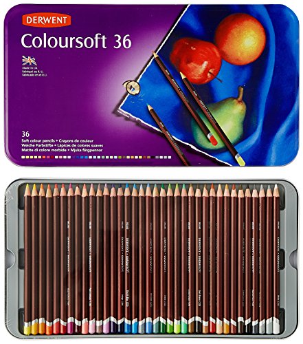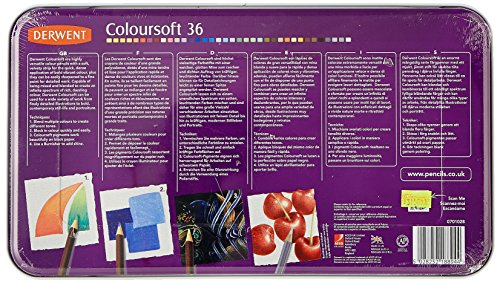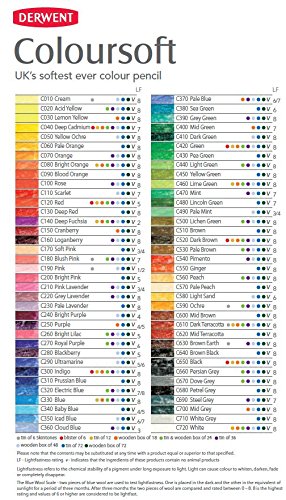 Derwent Colorsoft Colored Pencils offer a velvety soft core is perfect for mixing and blending; the perfect mix of a colored pencil and a pastel; hues are rich and the barrels are sturdy for a sure grip; lightfastness ranges from 2 to 8