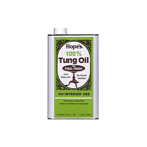 The Hope Company 32TO12 1 Quart 100% Tung Oil will clean your wood to a natural, brilliant shine. Tung oil is an exotic, naturally drying oil imported from South America and China and is recognized by craftsmen to be the "ultimate" drying oil for all fine woods. Unlike other finishes that sit on the woods surface, tung oil penetrates deep into wood fibers, cures, and actually becomes part of the wood. It forms a low gloss "hand rubbed" finish that's not only beautiful, but remarkably durable. Resistance to moisture and alcoholic drinks is truly amazing. The oil is not thinned or diluted, but 100% pure tung oil.Feature