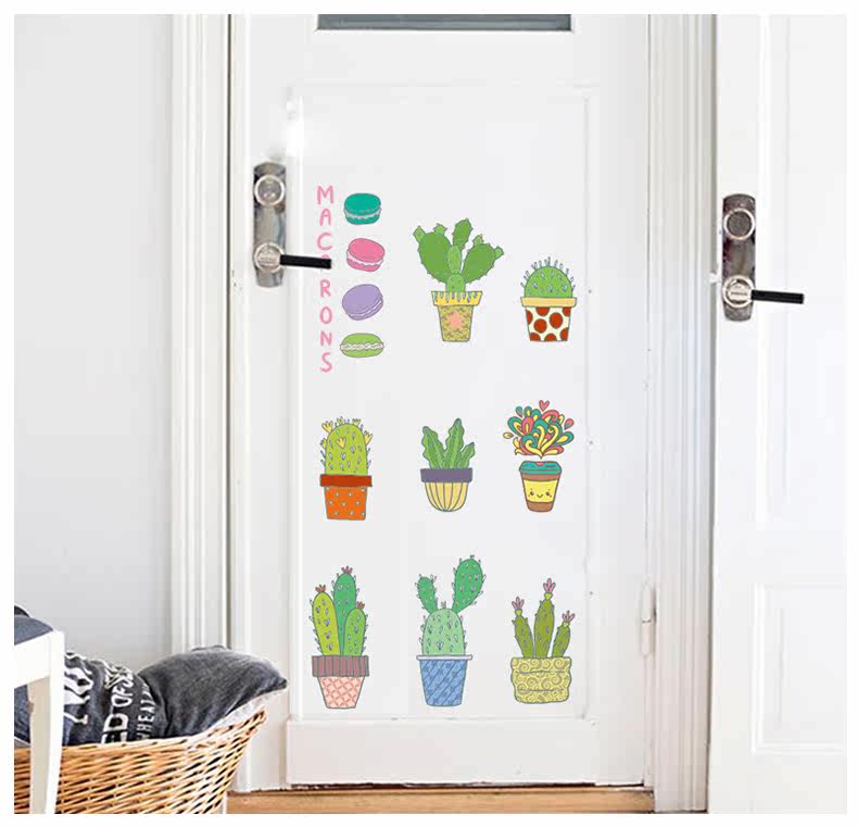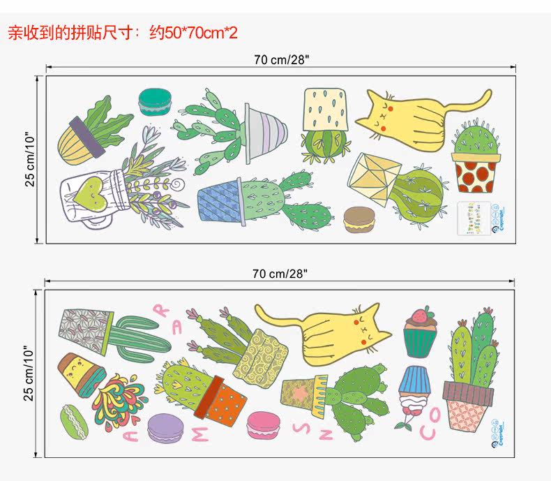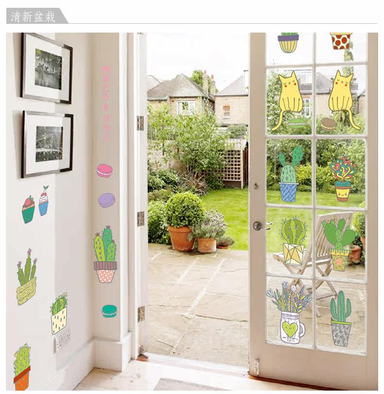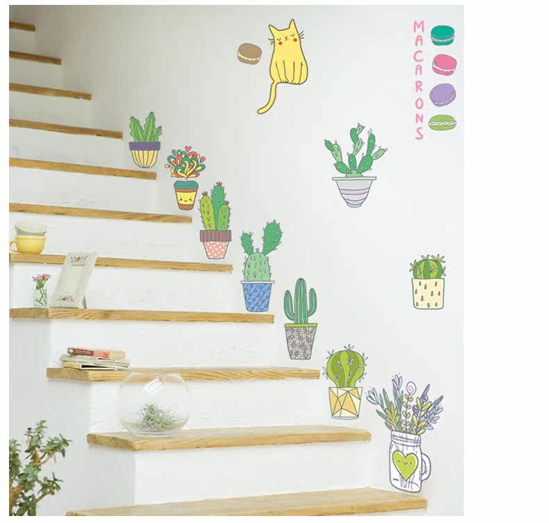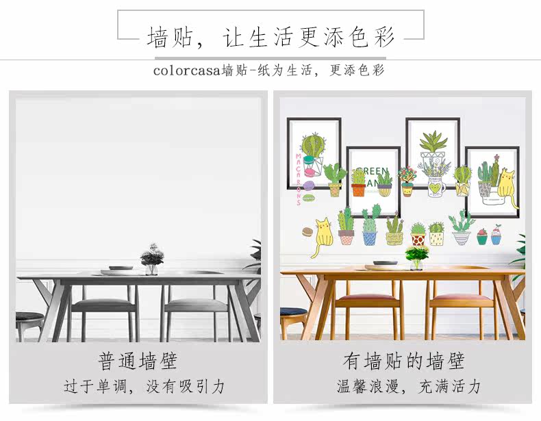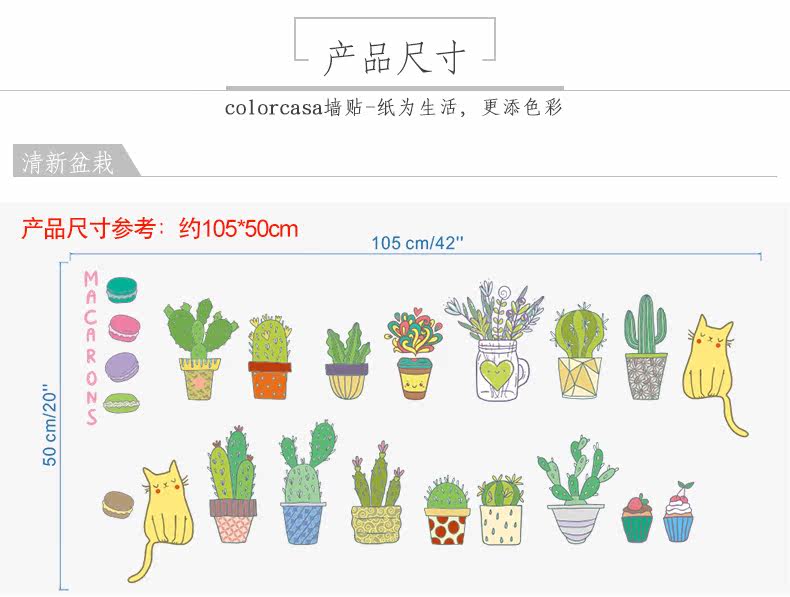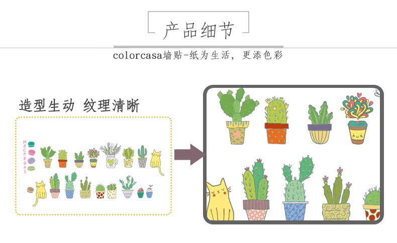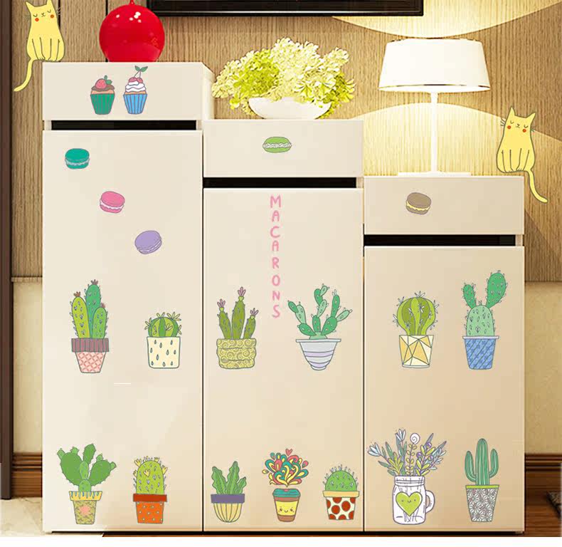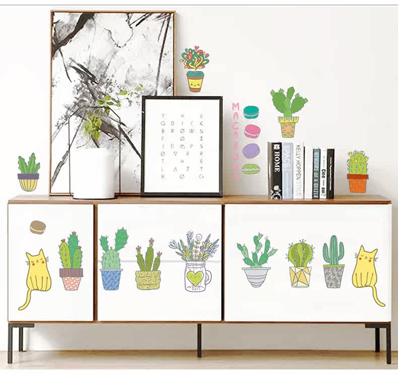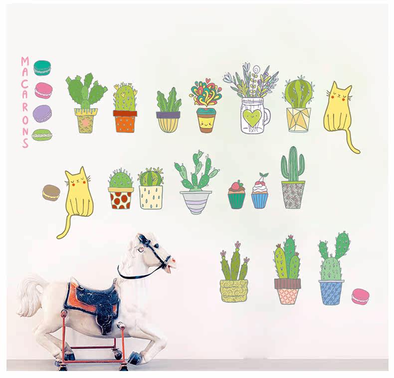 仙人掌小植物可爱卡通小猫咪客厅卧室背景墙贴环保可移除装饰贴纸