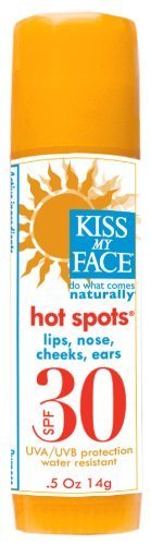 Sun Care HotSpots SPF 30 by Kiss My Face 0.5 oz Stick ORGANIC HOT SPOTS SPF 30 This is perfect for all those delicate facial areas that need protection from the sun - ears brow lips nose cheeks. Made with 52 certified organic ingredients including beeswax coconut oil aloe and wild-crafted shea butter this non-scented water-resistant stick is the perfect source of natural sun protection.Our lip balms contain no artificial colors unnecessary chemicals and were not tested on animals. Our lip balms contain no artificial colors unnecessary chemicals and were not tested on animals. Ingredients Active Ingredients Octinoxate Oxybenzone Octyl Salicylate Avobenzone Other Ingredients Certified Organic Beeswax Shea Butter Certified Organic Coconut Oil Certified Organic Aloe Vera Tocopherol (Vitamin E) Extracts of Calendula Cucumber Elder Flower Rosehips and Geranium