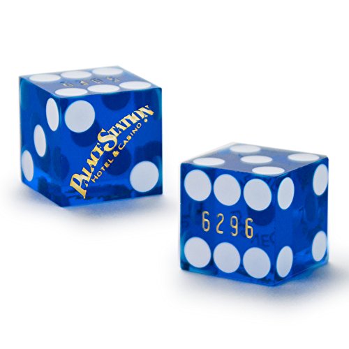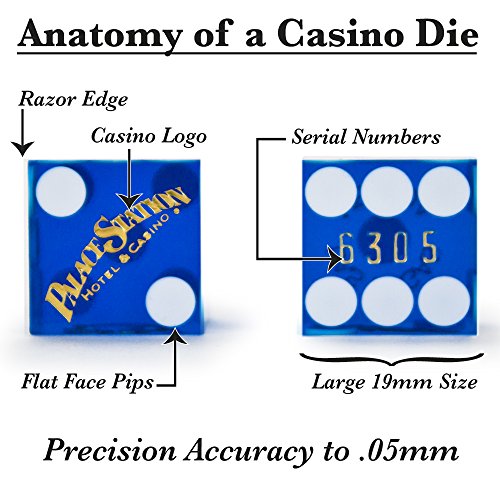 Every casino die is like a little piece of art. Jumbo-sized 19mm sides, flush pips for perfect balance, and sharp, razor edges for random rolls. A mechanically-machined masterpiece, manufactured to exacting, stringent specifications to suit the needs of casinos the world over. This particular pair of dice comes straight to you from the craps tables of the Palace Station Casino. The 2 side of every die bears the casino's logo, and the words Las Vegas, Nevada encircle the 1 pip. Between the pips of the 6 side is a gold, hot-stamped serial number which ensures authenticity and keeps players honest.