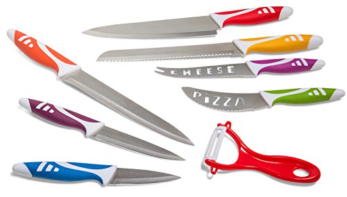 OxGord 가,모든 키친에 최적이 8 개들이의 컬러 나이프세트를 전달합니다.7 종류가 독특한 나이프와,인간공학에 기초했 사용하기 쉽다필러1 개부착.이 콜렉션에는 쿠킹,baking,사전준비 등 여러가지 용도로 필요한 나이프가 모두 갖추어지고 있습니다.크리스마스,웨딩,결혼 축하해 파티나 생일 등의 선물에 최적.이 다용도 나이프세트에는,매일의 조리에 최적인 풀크기의쉐프나이프가 포함되어 있습니다. 마치 버터를 자르는 것 같이 간단하게 빵을 자를 수 있는 톱니 모양의 이