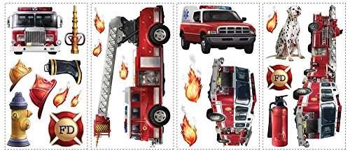 -. Binding : Kitchen -. Brand : Sticker Hot -. Color : Red -. Feature : Removable, Repositionable Vinyl Peel and Stick Bedrom Decorations / Dimensions: 4 sheets of 10" x 18" / Number of Wall Decals: 22 -. IsAutographed : 0 -. PackageQuantity : 1 -. ProductGroup : Home -. ProductTypeName : HOME -. Title : New FIRE TRUCKS WALL DECALS Fireman Bedroom Stickers Kids Red Decor Decorations