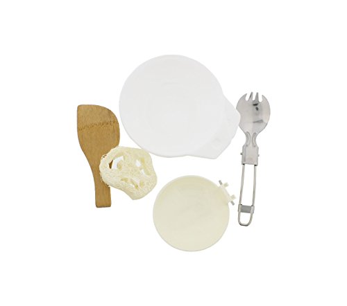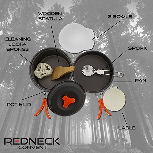 Full cookware set for 2 people: set includes 1 pan, 1 pot & lid (hold 1 liter), 2 bowls, 1 ladle, 1 spork, 1 wooden spatula, 1 cleaning loofa sponge and a drawstring carrying case