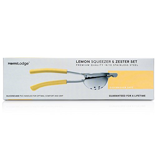 -. Feature : JUICING NO LONGER A CHORE: Say goodbye to pain in your hands from squeezing lemons, oranges and other citrus fruit. No more juice spraying all over your kitchen, picking seeds from your freshly squeezed juice and having to work the pulp out of the grooves. With our Citrus Press you can say hello to yielding more juice, from more fruit, in less time with minimal effort! / ZESTING MADE EASY: The best citrus zester available, to give you perfect results, super quick, every time, with no pith! How many times have you grazed your hand when grabbing your grater from the drawer? Problem solved with our clip on blade protection cover, keeping the grater sharp and your skin intact. / MADE TO LAST A LIFETIME: Our heavy duty commercial grade Stainless Steel Lemon Squeezer and Lemon Zester Set, with ergonomically designed silicone handles for your comfort and grip, ensures our kitchen tools are easy for you to use, provide great results and what's more are dishwasher safe for easy cleaning! Unlike other brands you can rest assured our range of premium kitchenware will not corrode or break easily! / IDEAL FOR COOKS, BAKERS AND COCKTAIL LOVERS: Are you or someone you know forever making lemonade, lemon water or other citrus juices? Do you love to bake whether it be lemon meringue pie, lemon bars or key lime pie? Make life easier by adding our premium lemon squeezer and lemon zester combo set to the utensil drawer. Our premium combo set is a great gift for mom, gift for dad and gift for kitchen lovers. / 100% RISK FREE PURCHASE: Here at HermiLodge we set the standard when it comes to high quality kitchenware. We are so confident in the quality of our products that we guarantee them for a lifetime. If you aren't completely satisfied with your purchase of our citrus press and grater simply contact us for a full refund. So don't delay and order today!