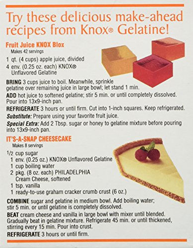 KNOX Unflavored Gelatin is the high quality, clear gelatin product used for preparing gelatin-based menu items, such as appetizers, salads, and desserts. If you have ever simmered meat bones for a soup then chilled it, you may have noticed a slight jellied effect to the broth. This result is due to "collagen", a protein substance which yields gelatine and is found in the bones, skin and connective tissue of animals. In manufacturing, unflavoured gelatine is extracted from the collagen by hot water, then concentrated and filtered for purity and clarity. It is cooled, extruded and dried into glassy brittle strips. In 1889, Charles B. Knox of Johnston, New York discovered a method of granulating gelatine by breaking down the strips using high speed mills. Most unflavoured gelatine is packaged in pre-measured individual envelopes for convenient usage. Each envelope of Knox® Unflavoured Gelatine will gel 2 cups of liquid. If the recipe you want to use calls for unflavoured gelatine by the tablespoon, just use 1 envelope for each tablespoon called for. Unflavoured gelatine has no flavour of its own and contains no sugar, unlike many flavoured gelatines which contain mostly sugar as well as artificial flavours and colours. This makes unflavoured gelatine extremely versatile: it can be used to create desserts, salads, main dishes, jams and jellies, even ice cream and frozen yogurt! Knox® Unflavoured Gelatine contains only 6 calories per serving (or 25 calories per envelope) and can easily be used to prepare "lower-in-calorie" recipes.