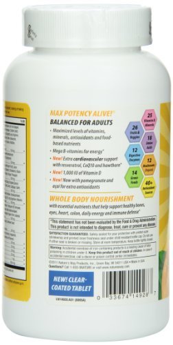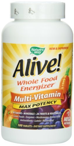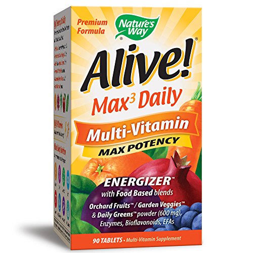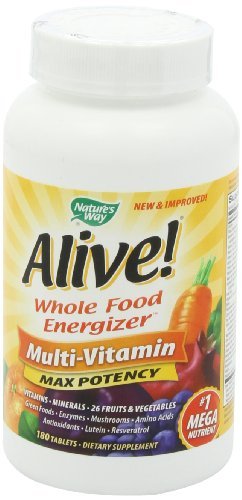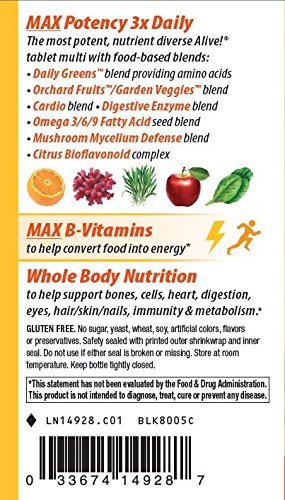 Alive! Max3 Potency contains a diversity of daily essentials, whole food concentrates, phytonutrients, and antioxidants to nourish, protect and invigorate your body. This Whole Food Energizer multivitamin is made with daily essentials, botanical energizers and system defenders including: 25 vitamins and minerals, 18 amino acids, 12 digestive enzymes, 14 green foods, 12 organically grown mushrooms, 40+ antioxidants. Alive! Max3 Potency is packed with high potency B-vitamins to help convert food into energy, Orchard Fruits and Garden Veggies and nutrients for whole body nourishment to help support bone health, daily energy, colon health, eye health, heart health, and immune defense. Alive! Max3 Potency provides 200 mg fruit/vegetable powder, extract and dried juice per serving.