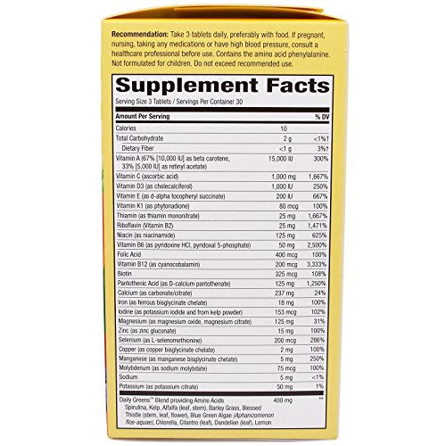 MULTIVITAMIN: Alive!® multivitamin for adults contains a diversity of daily essentials, greens, phytonutrients and antioxidants Vitamins A, C, and E