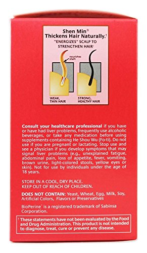 Dietary Supplement. 3 Day supply. The original hair nutrient from the far east! Applied science for healthy hair. 1% Natural herbal blend. Shen Min, meaning Life or Vitality, has been used for centuries in China for nourishing and maintaining youthful hair. Shen Min uses only the finest proprietary blend of He Shou Wu roots for maximum effectiveness and results. For added effectiveness, we have included Biperine, shown to enhance the bioavailability of nutritional compounds to deliver maximum results. No sugar, starch, artificial colors, preservatives, or yeast. Promotes healthy hair, naturally! (These statements have not been evaluated by the Food and Drug Administration. This product is not intended to diagnose, treat, cure or prevent any disease).Feature