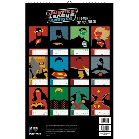 16-month Justice League calendar 2017 includes 13 stunning images with large grids. This oversized calendar features an opening spread with a beautiful four-month (September-December 2016) calendar to plan the last four months of the year and prepare for 2017.