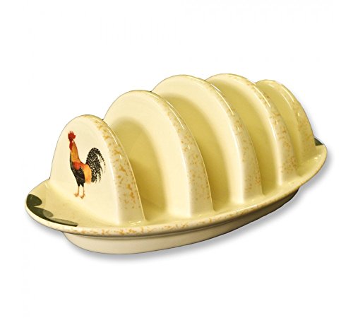 -. Feature : The cockerel motif features on each end of the toast rack whilst the cream background and the scalloped edge detail makes for a charming English country design. / This traditional hand decorated range features a colourful cockerel and is a charming country design suitable for both town and country lifestyles. This range is not mass-produced, it is hand-decorated and therefore subject to some colour variations. / Dishwashe and microwave safe / Approx size: 18 x 12 x 8cm - holds four slices