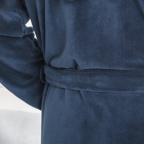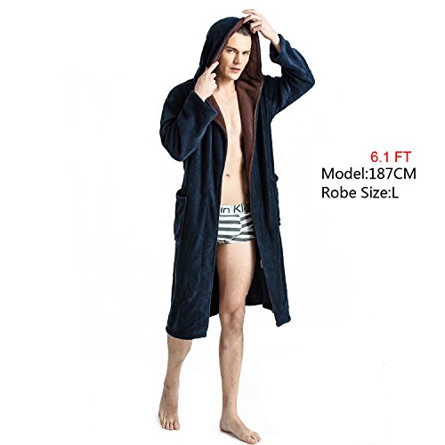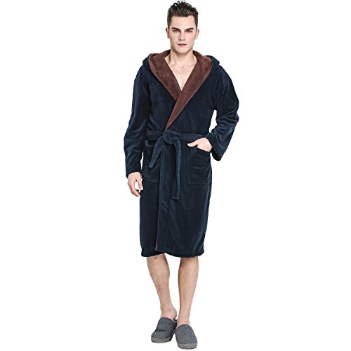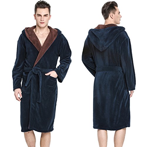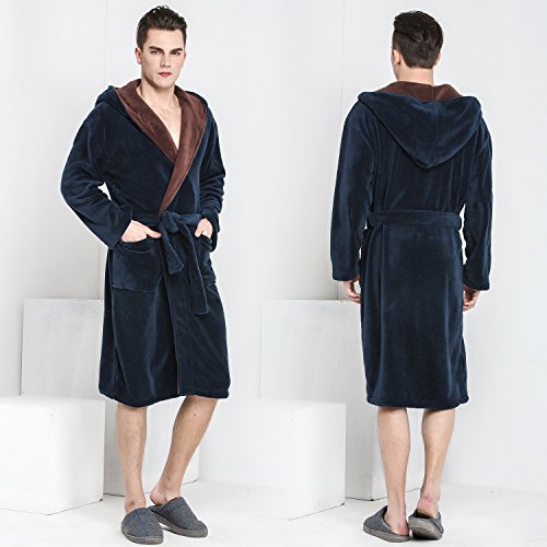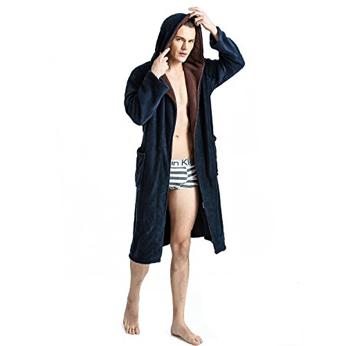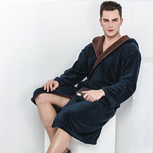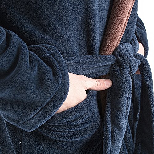 Navy Blue color base and Brown Shawl Collar with a Hood.Hooded bathrobe design helps to keep your neck and ears warm.Double belt loops and tie help secure a perfect fit around your waist.Machine washable; see product description for easy care instructions and best practices.Get full 9 photoes details please click list of pictures on the left.Please visit our Amazon store to view many other of our other Luxury items in stock this shopping season.