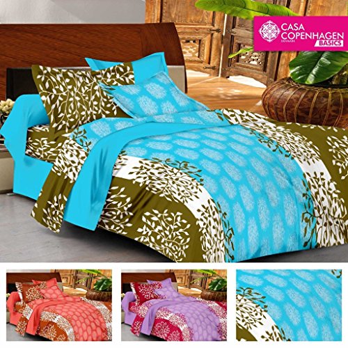 Casa Basics Ezy Collection Light Blue & Green Leafy Cotton Queen Bedsheet With 2 Pillowcases